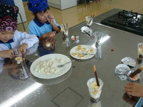 カップにチョコフレーク・白玉・アイス・バナナ・ポッキーを思い思いに