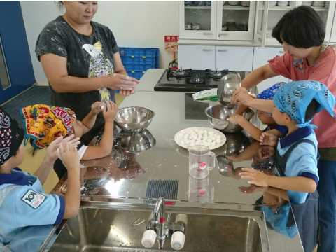 三班に分かれ白玉粉をコネコネ。こういうの子供は大好きですよね。