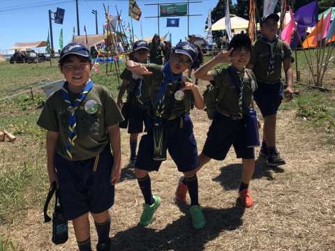 会場へ着くと、一気に晴れやかなムードに包まれました。会場で会う人々は皆、とても陽気です。私達は、まず茨城県のサイトへ。そこでは、昨年までカブ隊で共に過ごしていた仲間が、今はボーイ隊として参加しており、久しぶりの再会。互いに歓声あげながら触れ合いました。それにしても、ボーイ隊となった彼らの、なんとも逞しい姿。カブスカウトにも大きな刺激となったことでしょう。